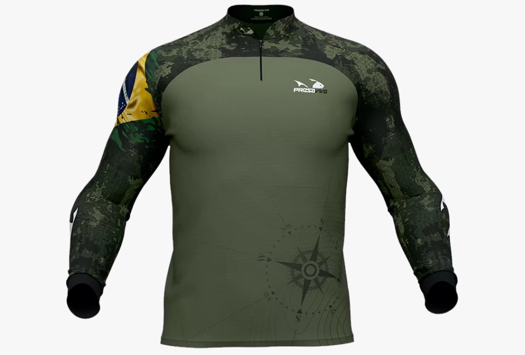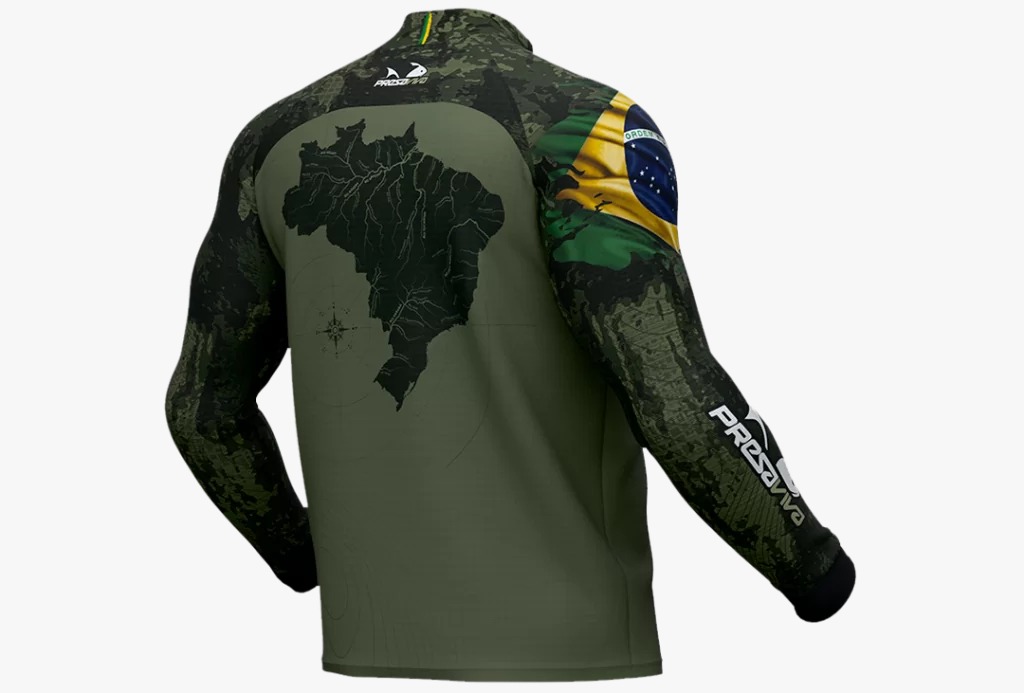 Camisa sublimada Presa Viva Tecnologia Dry, que proporciona máximo conformo térmico durante a atividade, modelo raglã manga longa, fechamento com zíper.